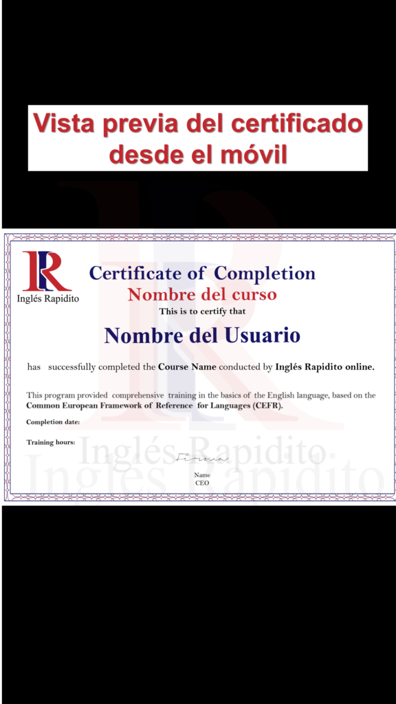«Los certificados emitidos por Inglés Rapidito solo garantizan el dominio de las habilidades lingüísticas mencionadas en cada certificación. Dichos certificados no pretenden ser certificaciones internacionales oficiales, ni garantizan la adquisición de habilidades lingüísticas específicas necesarias para el éxito en entornos académicos o laborales específicos. Si bien nos esforzamos por brindar certificaciones de calidad que demuestren el dominio del idioma inglés, es importante destacar que la evaluación y certificación es realizada por nuestra empresa y no está respaldada por ninguna organización externa En Inglés Rapidito estamos trabajando arduamente para conseguir alianzas estratégicas con organizaciones internacionales encargadas en la materia de certificación internacional de inglés. Para mas información haz click aquí para visitar los términos y condiciones de Inglés Rapidito en el apartado sobre certificados, para conocer más acerca de estos.»