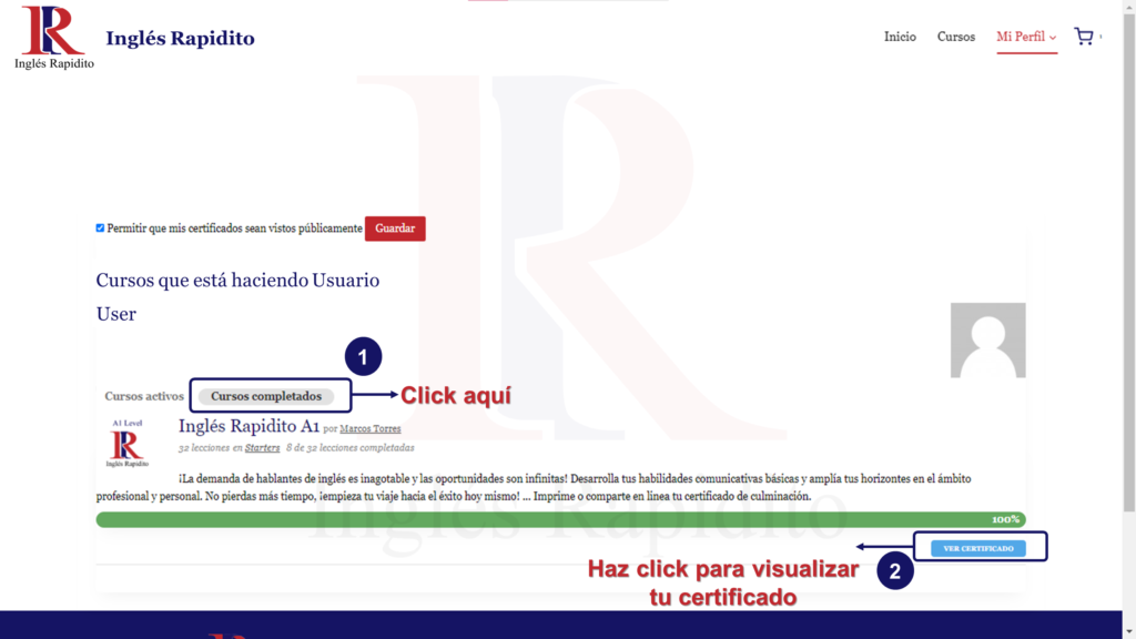 Al final de cada curso automáticamente en tu perfil, aparecerá la opción ver certificado, debajo del curso culminado.