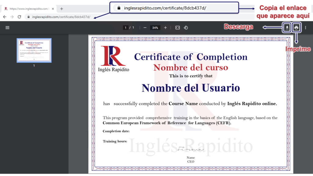 •Descarga tu certificado o imprímelo, para compartir tu certificado en tus redes o evidenciar tu logro, copia el enlace en la barra URL de tu navegador