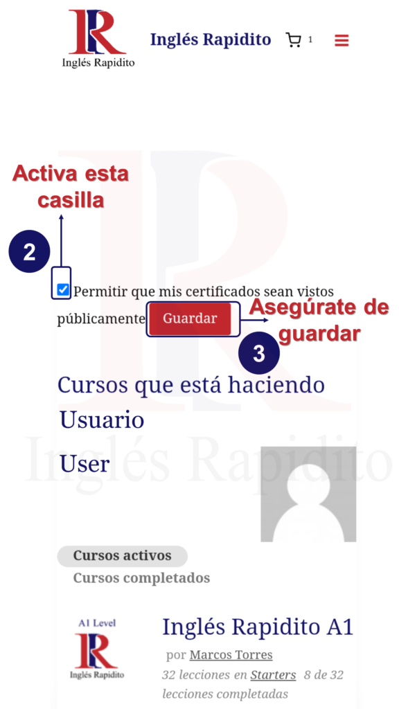 • Primero habilita la función permitir que mis certificados sean vistos públicamente en Mi perfil y guarda.